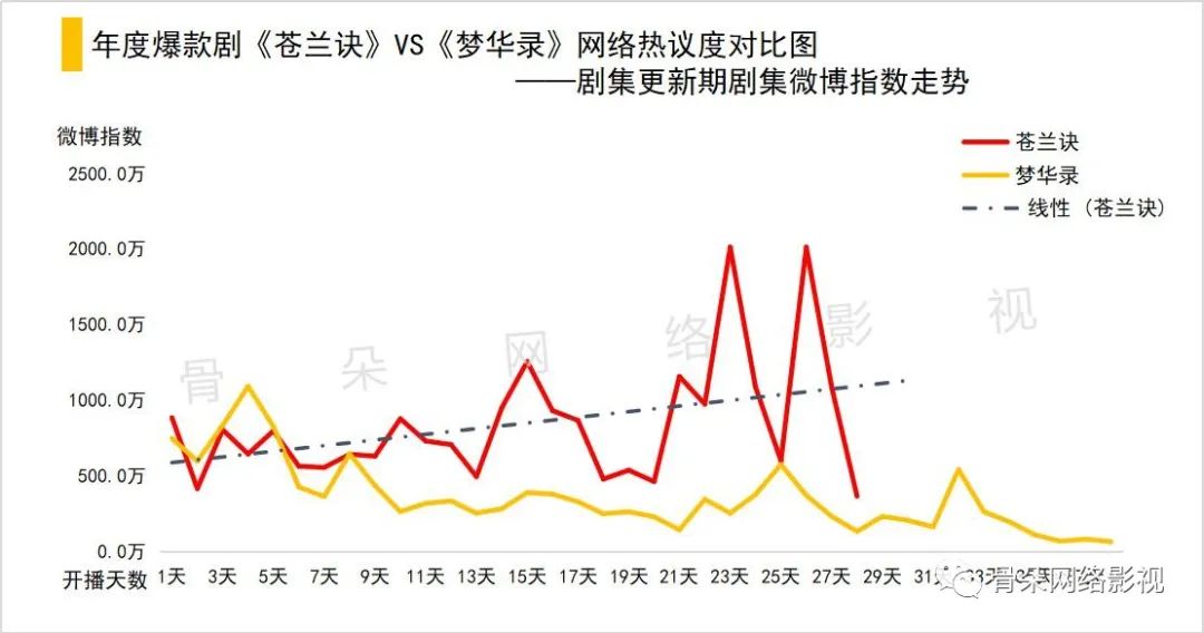 尽管《星汉灿烂》和《沉香如屑》同样采用了首周连更的排播,但其首周连更的天数和集数都少于《苍兰诀》。从次周起,两部剧分别回归了“播三休四”和“播四休三”的常规排播方式,之后剧集的抖音指数小峰值基本都低于首周,呈现逐渐回落的态势,剧集完结时虽能迎来一波回涨,但与首周相比仍有一定落差。以微博指数为标准,将《苍兰诀》与今年另一部古偶爆款《梦华录》进行对比,可以看出《梦华录》播放首周的小峰值明显高于《苍兰诀》,但始终坚持“播三休四”的《梦华录》在之后更新周的指数与《星汉灿烂》《沉香如屑》同样,呈降低态势。而《苍兰诀》则在首周连更热度发酵后,次周起微博指数迎来爆发式增长,完结日2013万的成绩暂时锁定年度剧集第一。