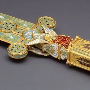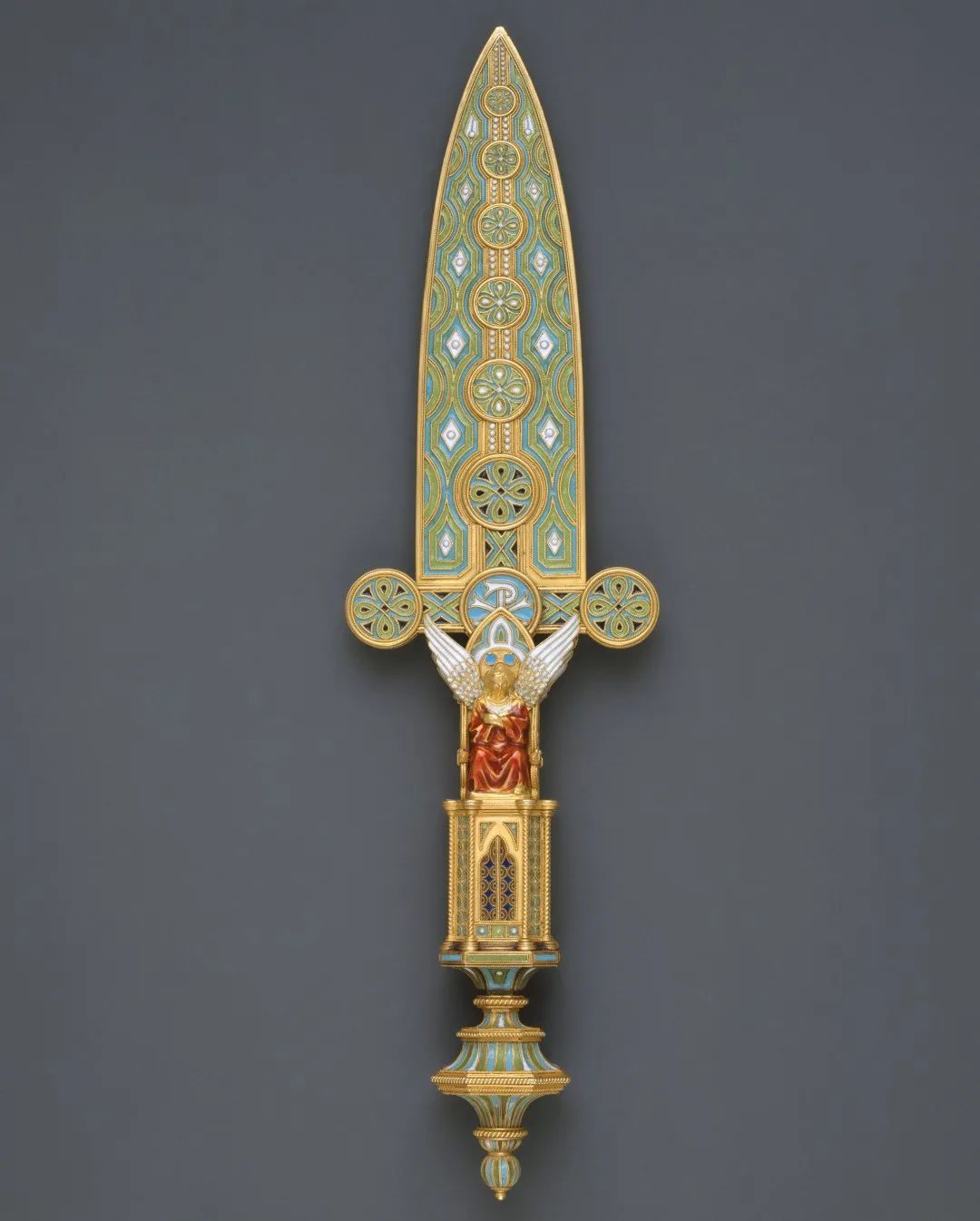 黄金嵌彩色珐琅精雕拆信刀 / 约1863年 / 现藏于大都会博物馆而彼时书籍制作工艺的有限,也使得拆信刀化身为阅读时用以分割纸页的给力帮手。这样的实用功能令其逐渐褪去“锋芒”,设计上变得平坦圆滑,尺寸也更为方正。如此一来,作为阅读保障而诞生的翻书杖才开始真正意义上出现于书桌上。