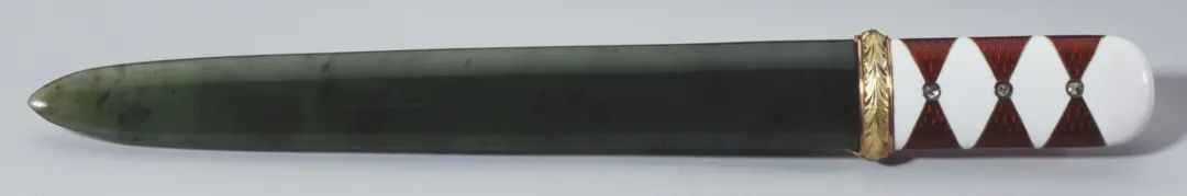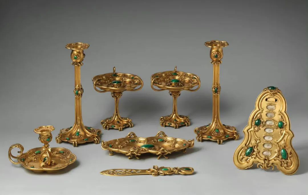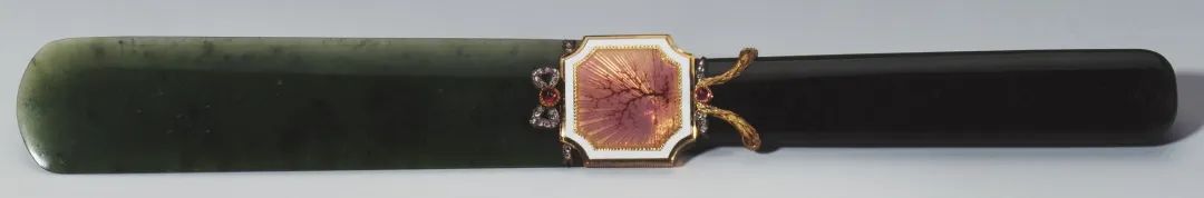 1851年,在水晶宫世博会展出的一套以铜鎏金嵌孔雀石打造的华美文具 / 出自英国名坊Asprey / 现藏于大都会博物馆黄金、纯银、各色宝石以及璀钻珐琅等珍贵材质的出现,无疑使得翻书杖如同珠宝般闪耀,更成为了皇室权贵们身份地位的象征。沙俄时期的著名珠宝大师法贝热,便曾创造过一系列极尽奢华的翻书杖等文房雅物,英国皇室也同样为之着迷。