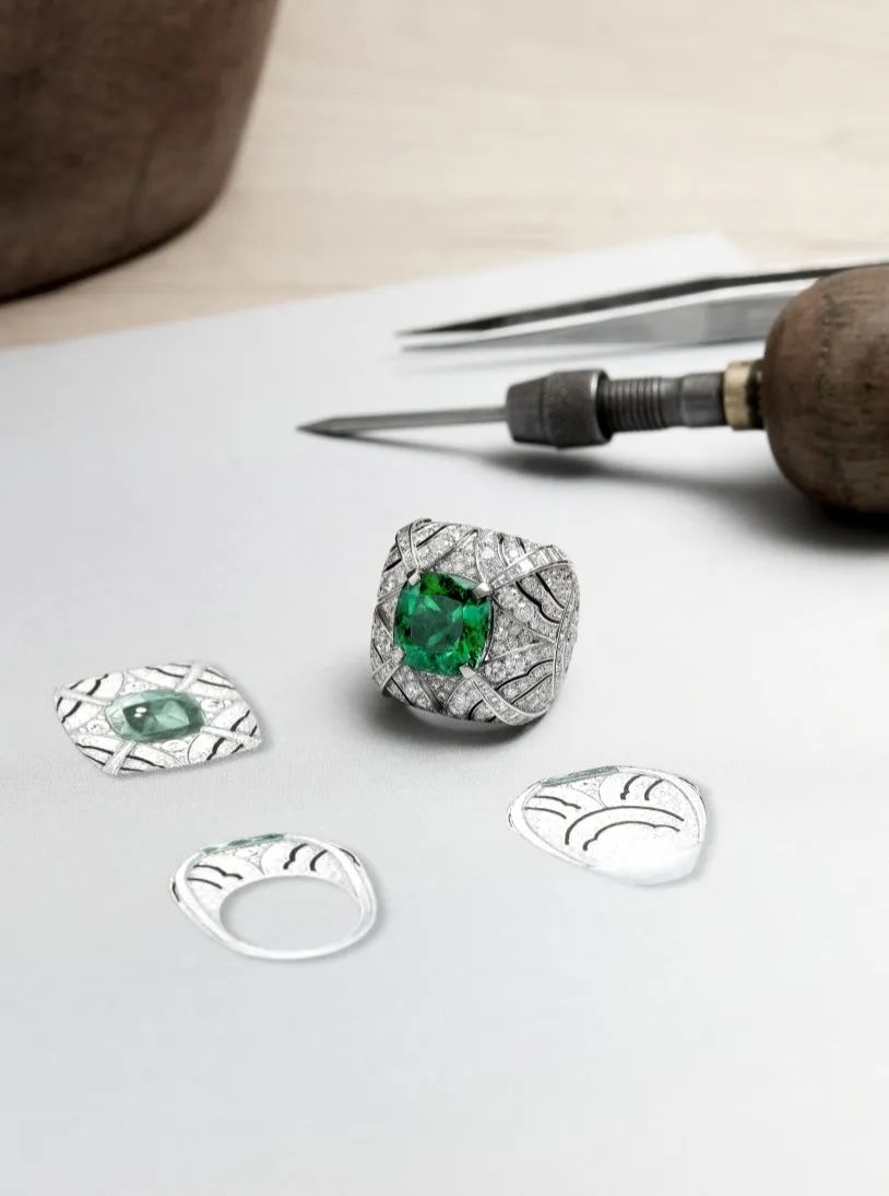 1920年代的art deco风格珠宝图稿中,可以发现大面积绿色的使用,与钻石的通透形成绝妙色彩对比。而自1858年建立以来,宝诗龙便是世界上为数不多的,始终保持着高级珠宝制作工艺的顶级品牌。回看历史,在传奇的万国博览会上,宝诗龙的亮相更是一鸣惊人,甚至曾被夸赞为“胆识过人的冠军,整个珠宝界都应以它为荣。”