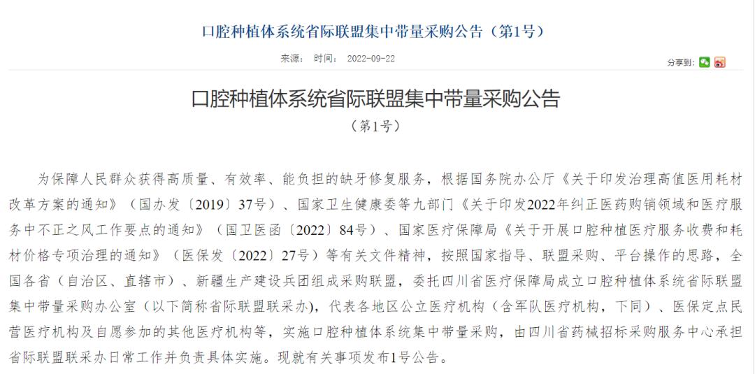 9月22日,四川医保局官网上发布《口腔种植体系统省际联盟集中带量采购公告(第1号)》,标志着集采从调研进入实质推进阶段。
