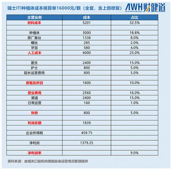 以佳美口腔一颗售价16000元/颗(全套,含上部修复)的瑞士ITI种植牙成本核算单为例,从下图财健道整理的数据可看出,材料成本和人工成本占比最高,分别达到32.5%和25%。