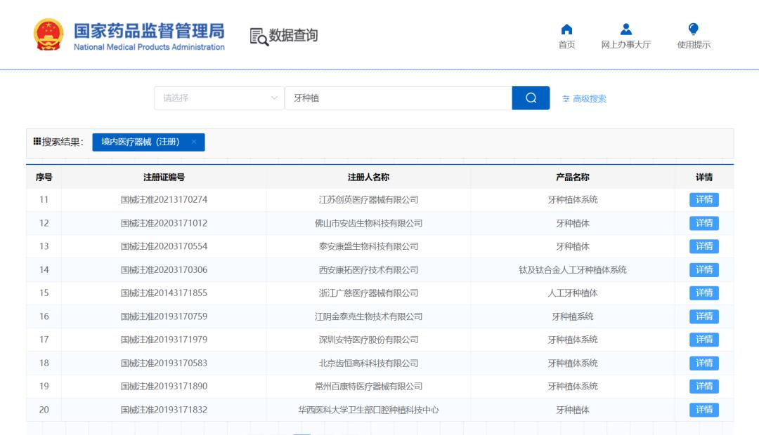 近年来,多家国内厂商的自研种植牙系统获批上市。据国家药监局官网信息,牙种植体/牙种植体系统获得三类医疗器械证的国内企业和机构共17家。