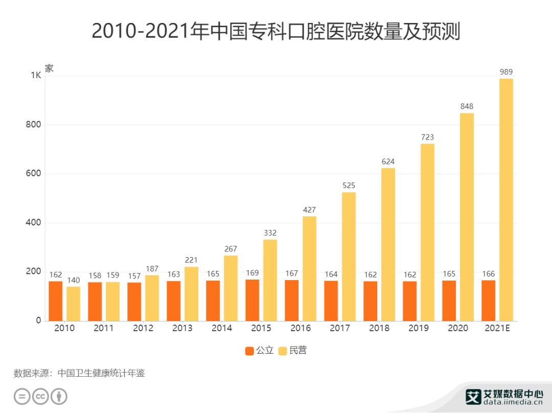 过去十年,是国内民营口腔连锁机构的黄金发展期,逐渐浮现出区域性龙头,并在资本市场成功上市。截至2020年,我国专科口腔医院共计945家,其中民营口腔医院数量781家。