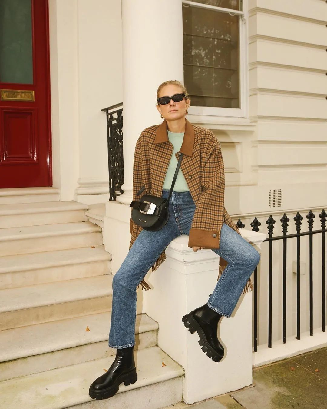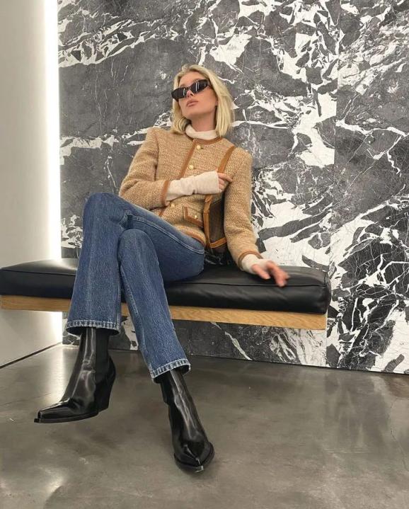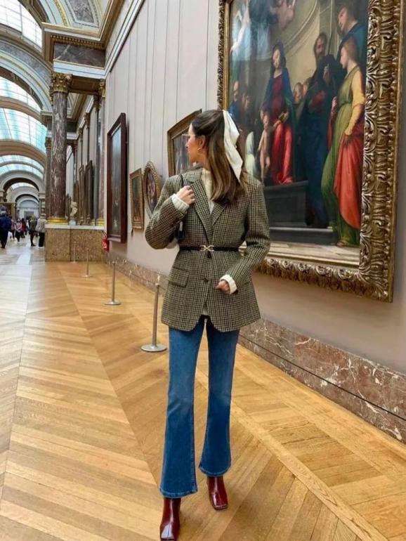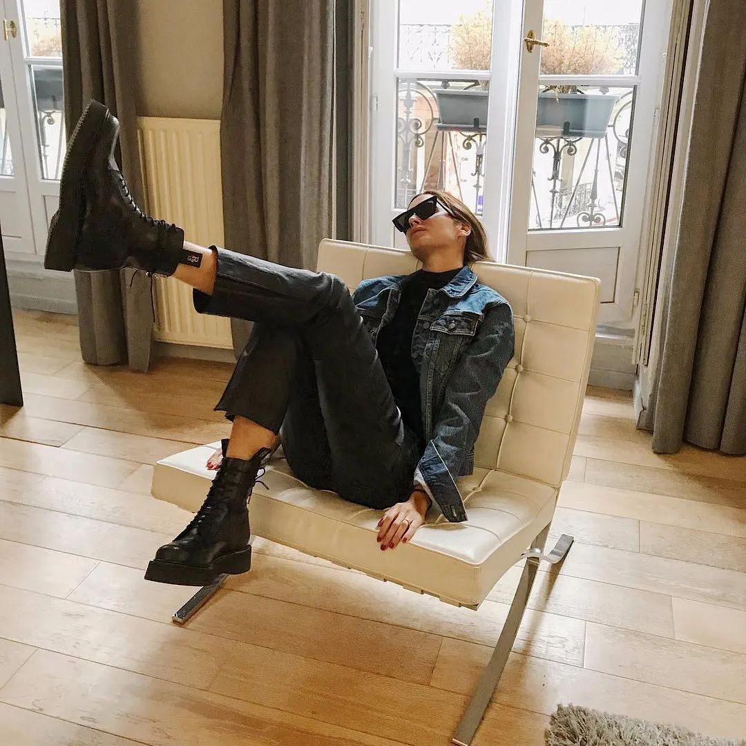 如果穿不惯高跟短靴,还可以试试这种厚底款式,搭配复古牛仔裤和格纹外套,酷炫又摩登,别有一番趣味。
