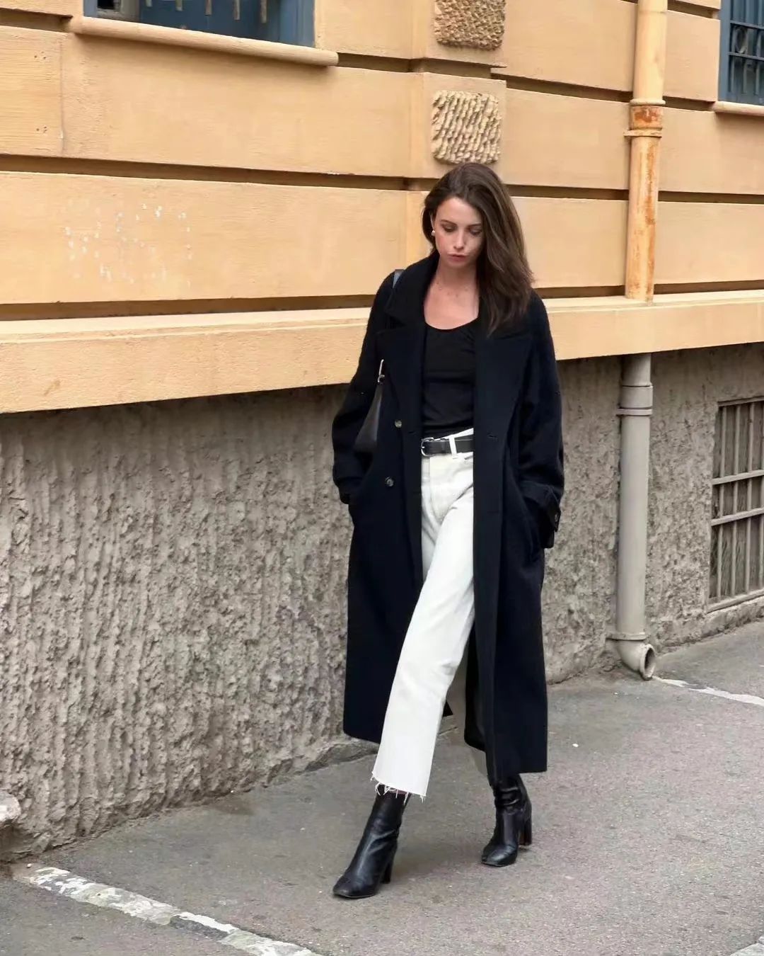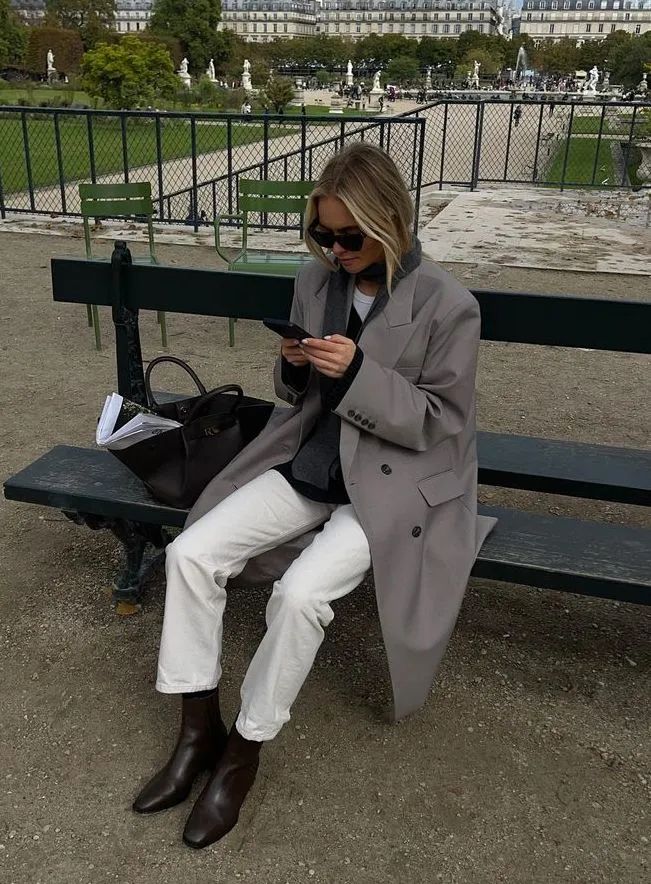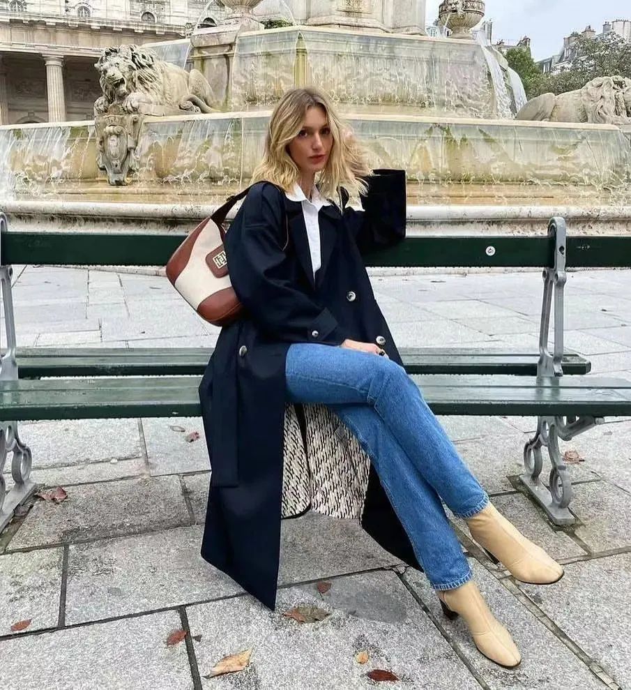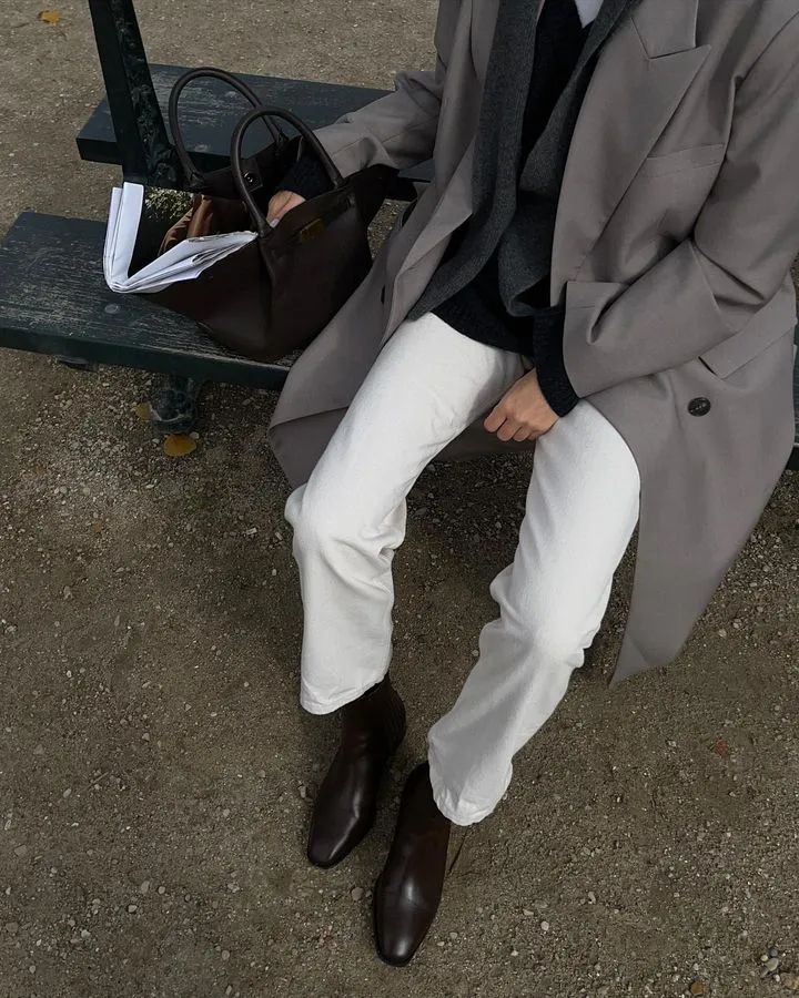 秋冬穿的长大衣+直筒小白裤,学法国女人那样pick较为宽松的版型,毫不费力就能打造出法式的慵懒与松弛感。
