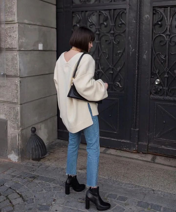 九分裤+短靴本就是公认的显高利器!九分长度的裤子刚好露出纤细脚踝,显高显瘦,再衔接一双高跟短靴,提升比例更是一绝!小个子女生一定要mark住。