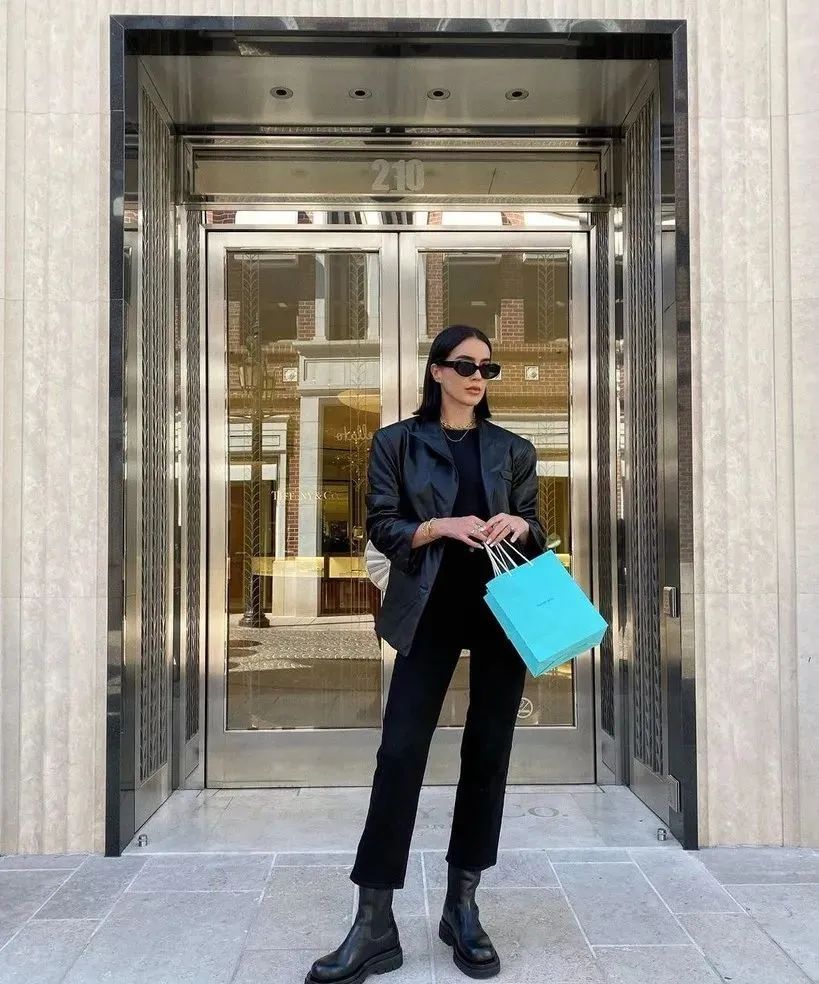 为了规避穿搭用力的风险,很多时尚icon会选择穿一身同色,利用不同材质碰撞出层次。而皮衣和皮靴的搭配放大了整体的帅气,穿出门不要太拉风。