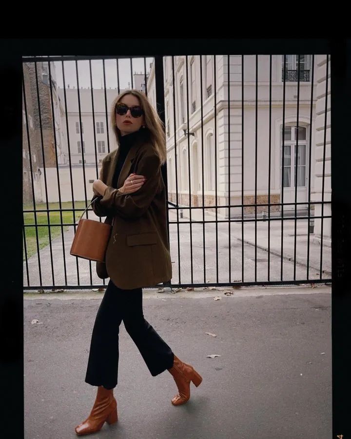 兼具风度与温度相较于前两年流行露脚踝的九分裤穿搭,今年秋冬更适合穿九分裤+短靴这对cp,没有露肤反而增加穿搭的层次,完美兼顾风度与温度。
