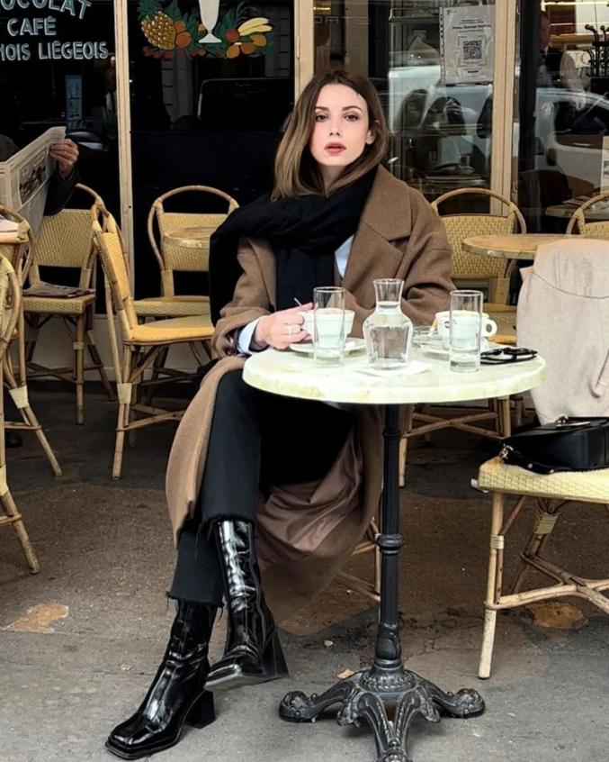 小黑裤与小黑靴的色系连贯流畅,延伸腿部线条的效果会更突出,看起来显高显瘦又有气质。