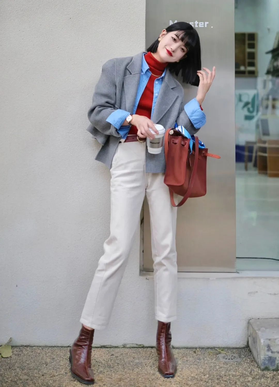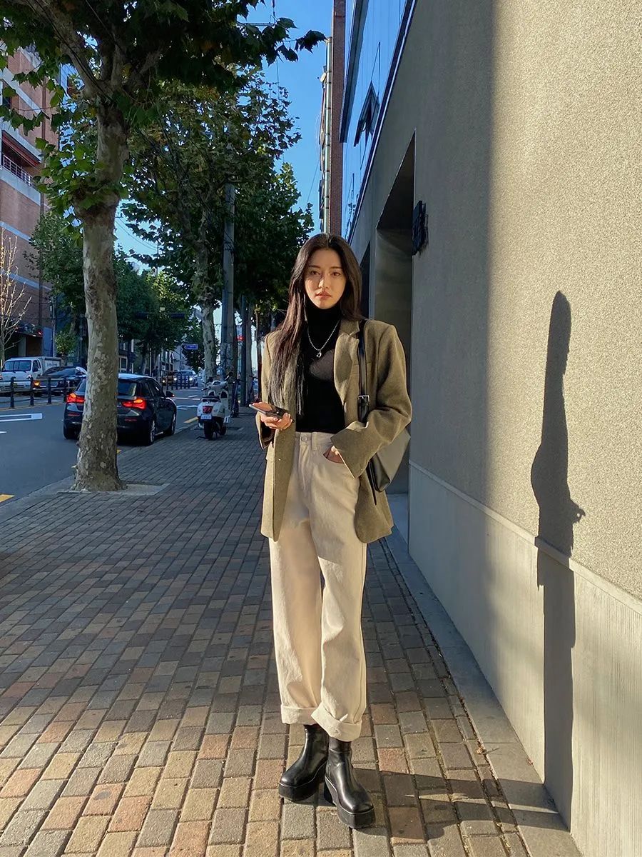 微微宽松的白色牛仔裤卷起裤脚,再搭配厚底短靴+西装外套+小高领就很韩范儿,迎合整体半商务半休闲的氛围。