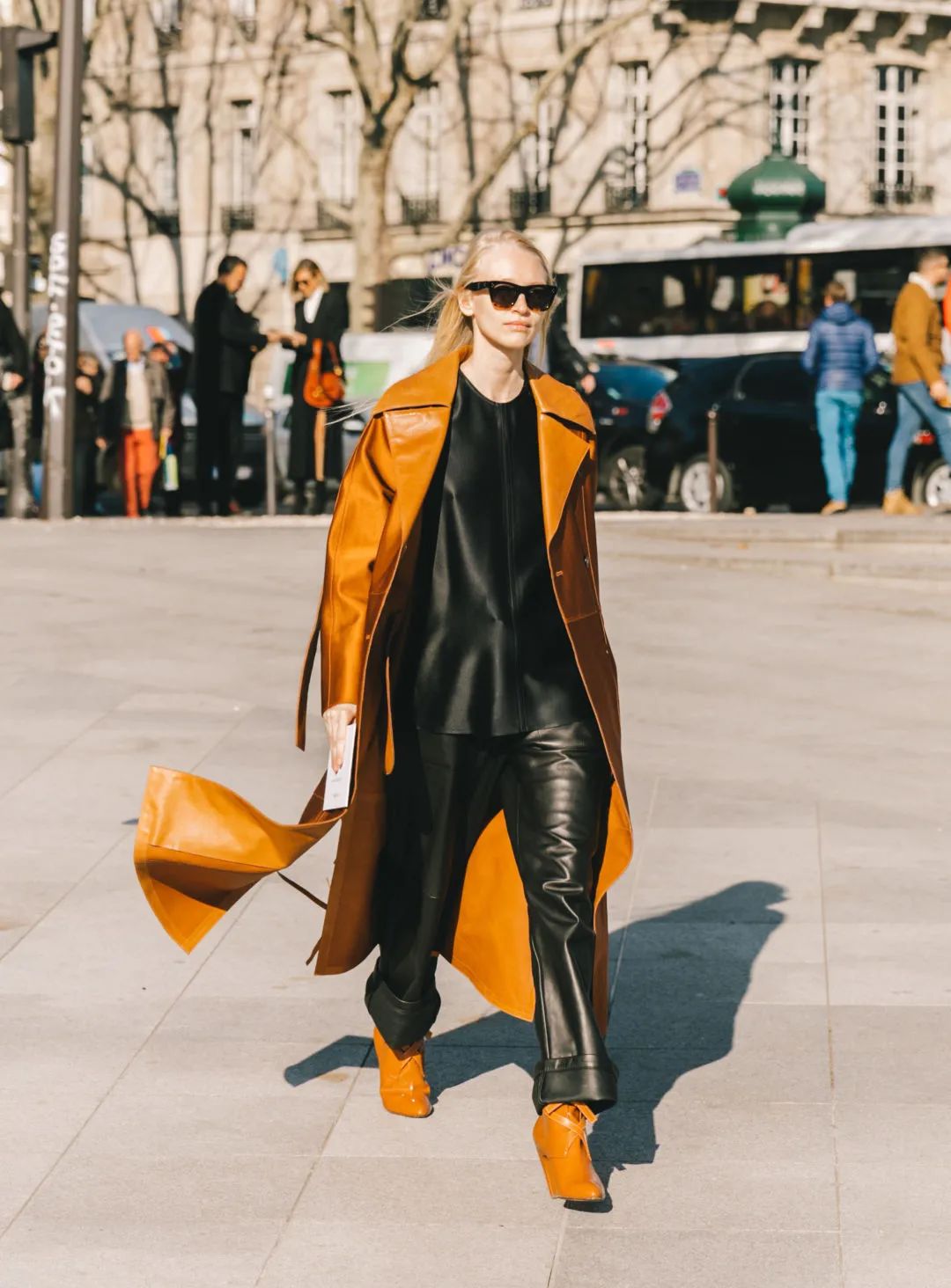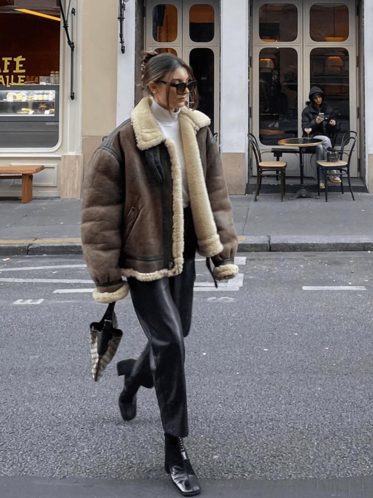 像这种宽大的麂皮外套,为了平衡穿搭,下装最好搭配直筒皮裤,营造“上宽下窄”既视感,让造型变得更有层次,时髦加倍。