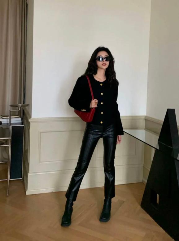 版型比较修身的皮裤适合身材匀称的宝贝,搭配气质满分的小香风外套,显得身材超好,让人觉得你是个精致又有品位的人。