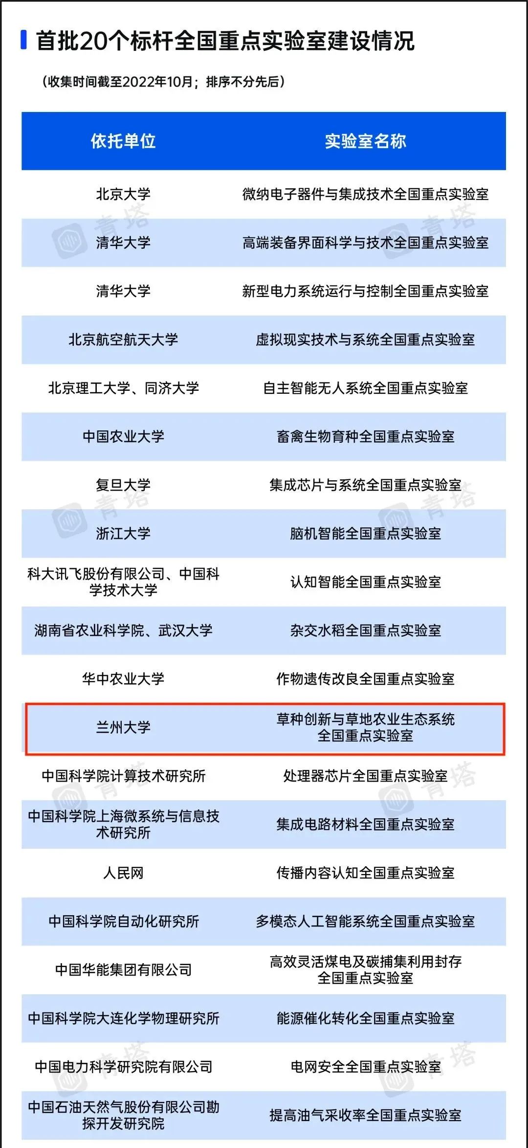 近日,青塔通过查询学校官网、媒体报道等多种渠道,收集整理了首批20个标杆全国重点实验室入选名单,涵盖12个高校。兰州大学草种创新与草地农业生态系统全国重点实验室入选,引发网友热情点赞关注。