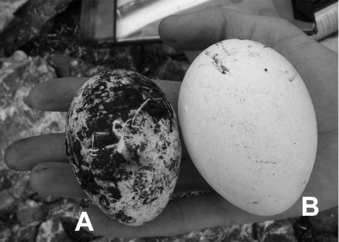 斯岛黄眉企鹅的两个蛋,B蛋比A蛋大,图片来源:参考文献[2]只是这种大小差异在翘眉企鹅中表现得最明显。