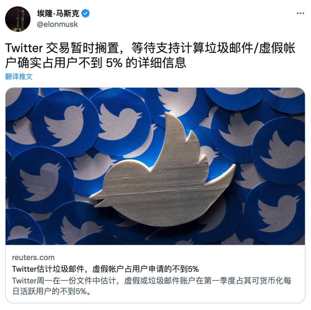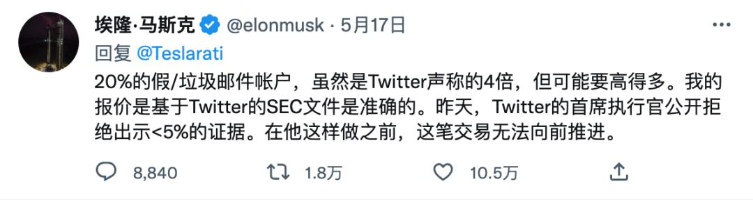 因为他要等推特给一个真实数据,关于推特到底有多少机器人账号的数量。
