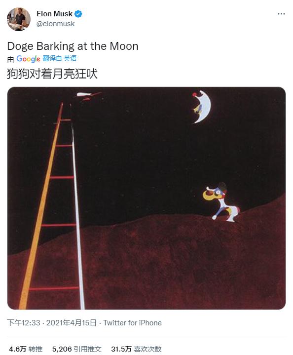 去年 4 月,他发推说“ 狗对着月亮叫 ”(此前说要带狗狗币去月球),结果狗狗币第二天涨幅高达 141 %。