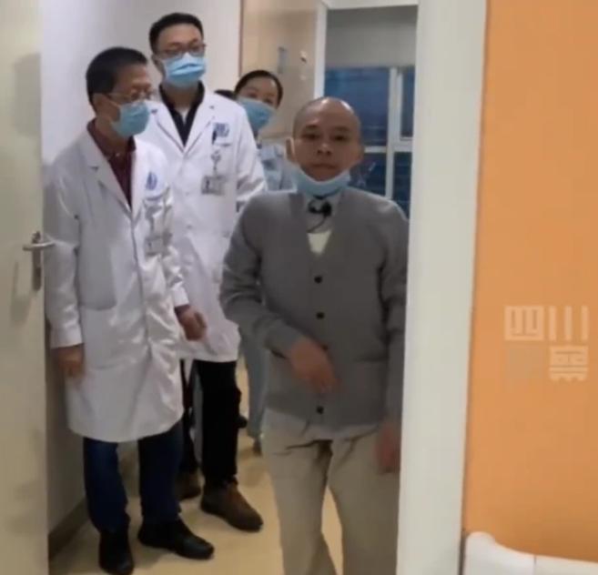 张建强在一众医生的看护下慢慢走出病房