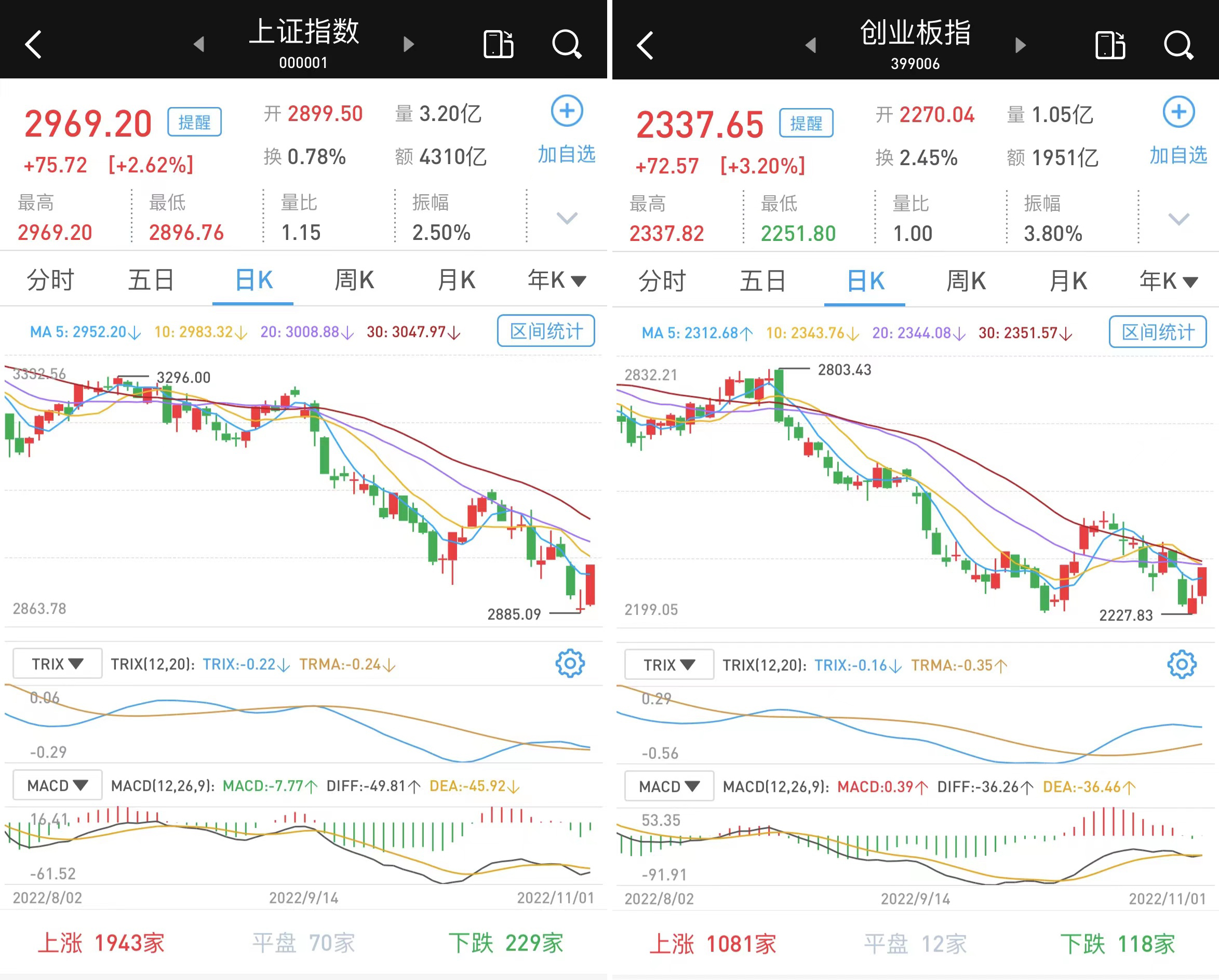 至11月1日收盘,上证综指涨2.62%,报2969.2点;科创50指数涨1.41%,报1024.52点;深证成指涨3.24%,报10734.25点;创业板指涨3.2%,报2337.65点。