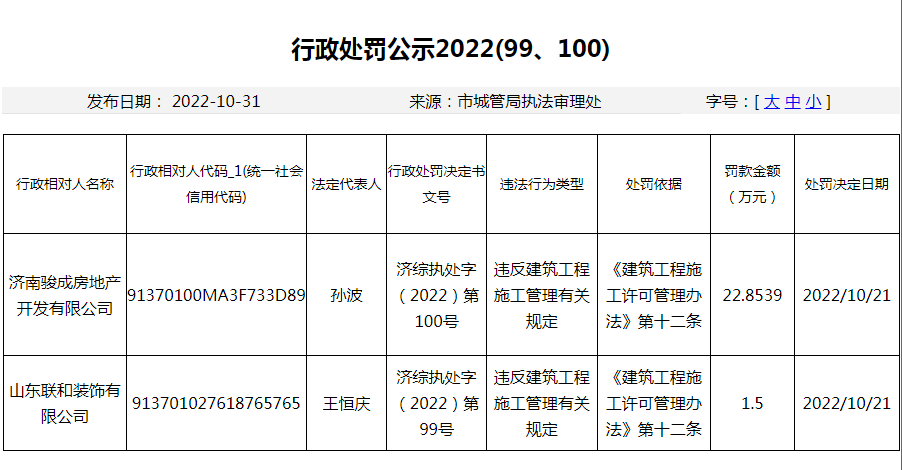 济南市城管局执法审理处10月31日披露的相关行政处罚信息显示,两家济南企业日前受到处罚。根据文号为“济综执处字(2022)第99号”的行政处罚决定书,山东联和装饰有限公司因违反建筑工程施工管理有关规定,而被济南市城管局罚款1.5万元;根据文号为“济综执处字(2022)第100号”的行政处罚决定书,济南骏成房地产开发有限公司同样因违反建筑工程施工管理有关规定,而被济南市城管局罚款22.85万元。处罚决定日期均为2022年10月21日。