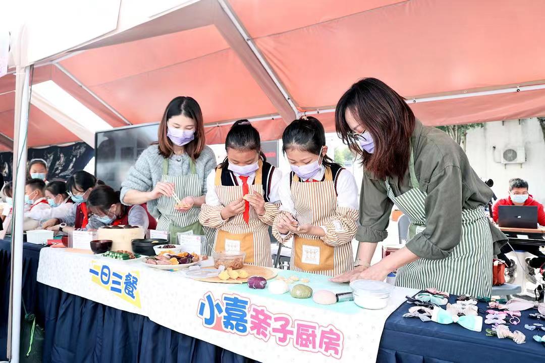 数十种丰富多彩的劳动教育项目在嘉年华上进行了集中展示,“小嘉亲子厨房”现场制作了五彩饺子,“一亩三分地”农学堂带来颗粒饱满的水稻。