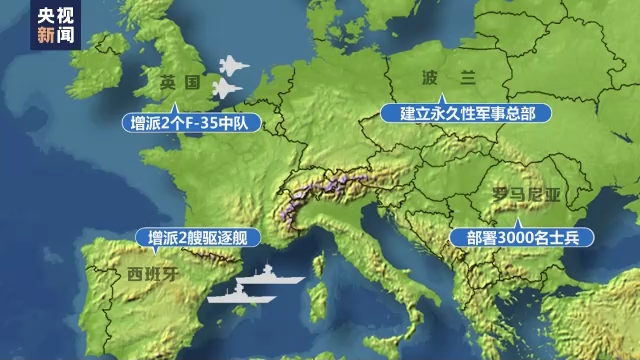 美国总统拜登当时还表示,美国将全方位增加在欧洲的军力部署,向西班牙增派两艘海军驱逐舰,向英国增派两个F-35中队,在波兰建立永久性军事总部,在罗马尼亚部署3000名士兵。同时,美国还将在波罗的海国家、德国、意大利等地增加军力部署。