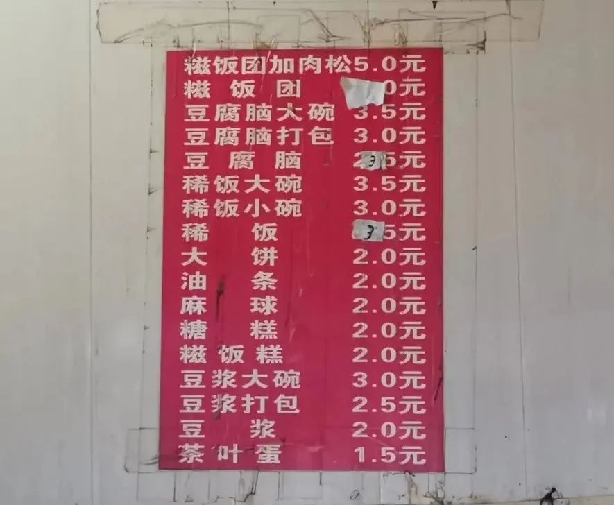 最贵的粢饭加油条,5元;最便宜的茶叶蛋,1.5元。豆浆2元,咸浆3元,大饼油条麻球糖糕都是2元的价格。