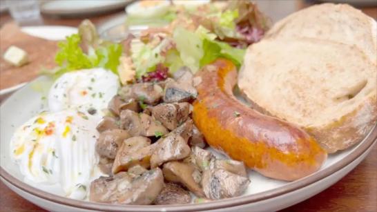 主推的combo98元,包括两个自选烹饪方式鸡蛋,酸面包,以及从培根、香肠、午餐肉、炒蘑菇、焗番茄、土豆饼里挑选两个配菜;