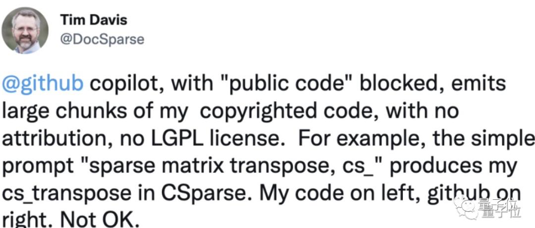 在听说马修他们要起诉Copilot后,德克萨斯A&M大学的一位计算机科学教授,并兼任ACM、IEEE和SIAM会员的Tim Davis也发推分享了自己的“遭遇”: