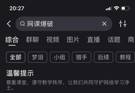 “网课入侵”、“网课爆破”——11月5日,如果在社交、视频平台上搜索这两个关键词,你会在多个APP的醒目位置看到以下“温馨提示”,甚至“警告”。