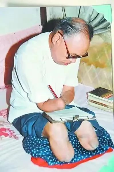 最开始,他尝试用嘴衔着笔写,但口水经常顺着笔杆流下去,浸湿了稿纸,字也模糊一片。他仅剩的右眼视力只有0.3,每天写不了几个字,眼睛就开始痛了。后来他就用两只残臂夹着笔,再用嘴固定,最开始写一个字有拳头大,后来慢慢的,越来越小,写得和铜钱一样大。