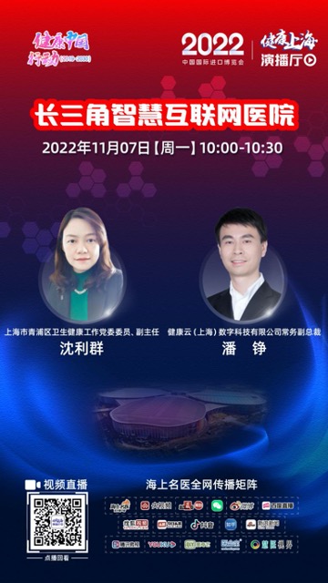 11月7日,在第五届中国国际进口博览会现场,“健康上海演播厅”特邀上海市青浦区卫生健康工作党委委员、副主任沈利群与健康云(上海)数字科技有限公司常务副总裁潘铮,共同展望“长三角智慧互联网医院”的无限可能。