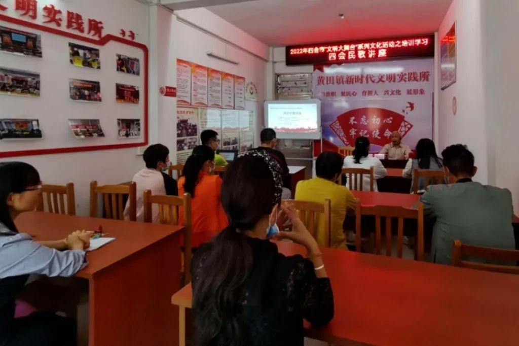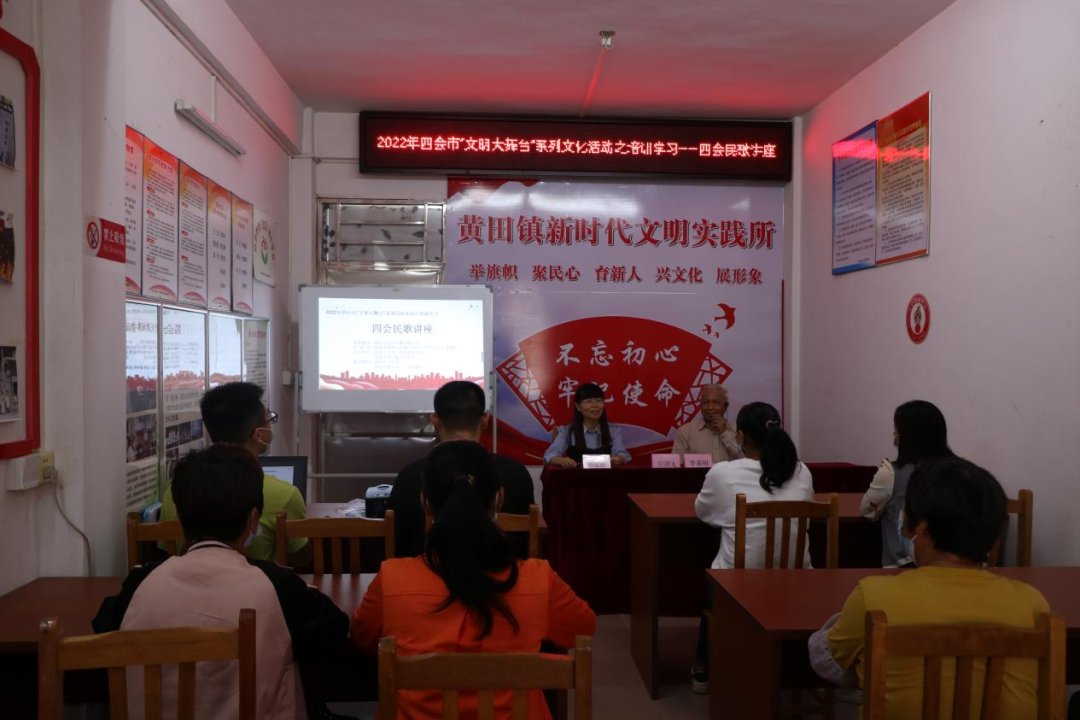 近日,为丰富人民群众文化生活,提升基层文化艺术水平,宣传四会文化正能量,由四会市文化广电旅游体育局、四会市黄田镇人民政府主办、四会市文化馆、黄田镇文广旅体服务中心协办的2022年四会市“文明大舞台”系列文化活动之培训学习——四会民歌讲座在四会市文化馆黄田镇分馆举行。本次活动特邀广东省级非物质文化遗产项目(四会民歌)代表性传承人李重明展开现场教学。