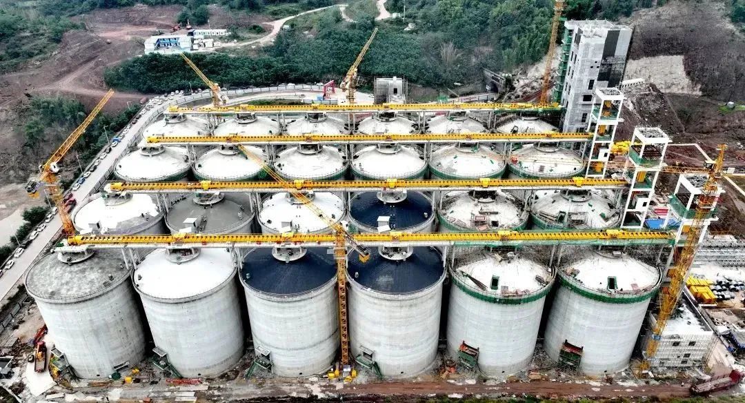 中储粮重庆万州粮食仓储物流项目10月22日,中储粮重庆万州粮食仓储物流项目一期浅圆仓及附属设施主体结构全部完工,进入土建收尾设备安装阶段。这是中储粮为加快完善沿江沿海重要物流节点布局,形成江、河、海联运,公、铁、水联动物流格局,打造的“前港中仓后厂”综合型基地。