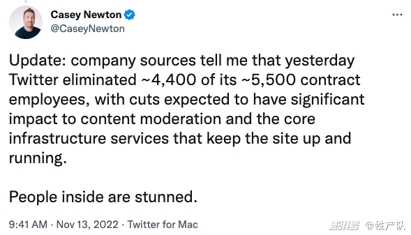 推特一共拥有合同工5500人,仅这一次被裁掉的合同工占比就高达80%。