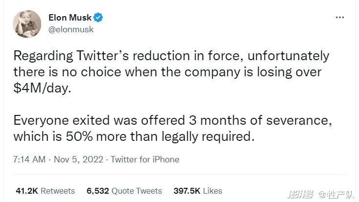 针对被裁员的推特员工,为了避免他们找工会去闹事,马斯克也做好了悉心的准备。裁撤正式工,一次性补偿3个月工资。按马斯克的说法是,我给的遣散费已经超出美国法律规定的50%了。