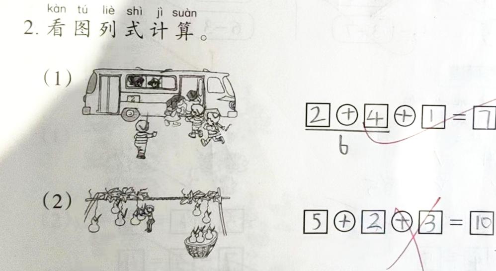 陈女士研究了一阵,也没想明白。而且,与之相邻的一道题,也是差不多的形式,有一辆公交车,车上有人,车下也有人,豆豆把车上的2人、正在上车的4人以及1个稍远处的全部加起来,列了一个“2+4+1=7”的算式,得到的就是“红勾”。