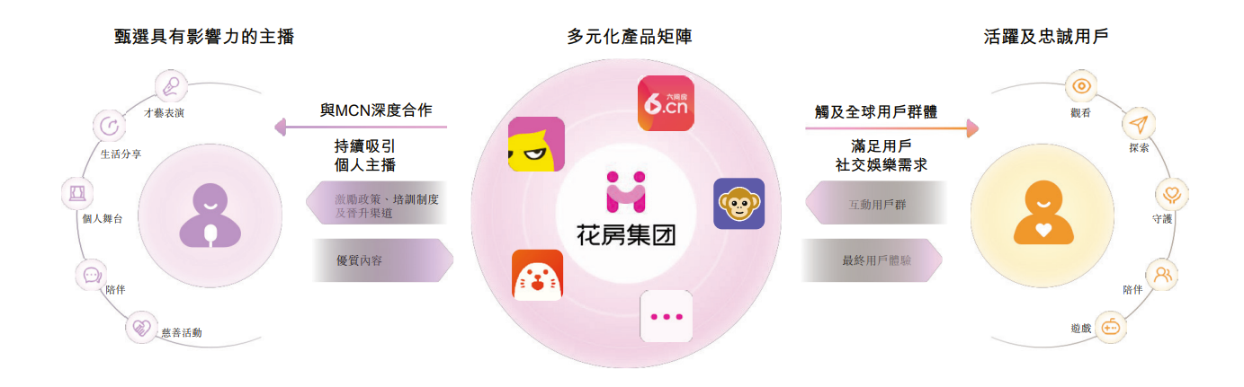 花房集团专注于在线社交娱乐领域,拥有从直播到一系列多元化的音视频社交网络产品及服务的业务组合。花房集团认为,精心打造平台,以满足中国及选定海外市场用户的需求及兴趣,尤其广受Z世代用户欢迎。