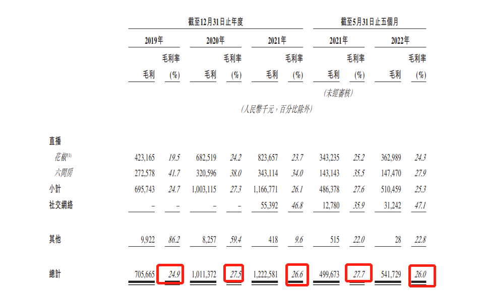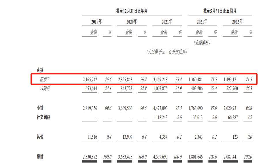招股书显示,2019年、2020年及2021年以及截至2021年及2022年5月31日止五个月,花椒产生的收益分别为21.66亿元、28.26亿元、34.69亿元、13.6亿元及14.93亿元,分别占花房集团同期收益总额的76.5%、76.7%、75.4%、75.5%及71.5%。