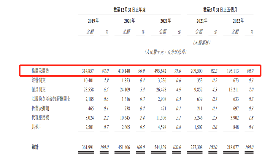 销售及营销开支方面,2019年、2020年、2021年及截至2021年及2022年5月31日止五个月,推广及广告开支分别为人民币3.15亿元、人民币4.1亿元、人民币4.96亿元、人民币2.095亿元及人民币1.961亿元。