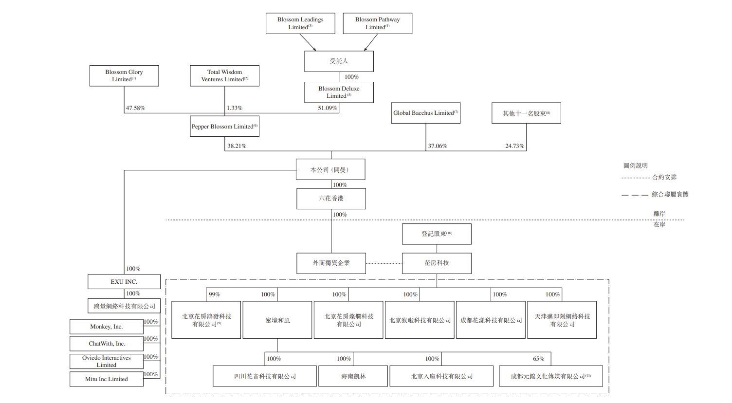 招股书显示,花房集团是一家中国互联网公司,为用户提供音视频直播娱乐及社交网络服务。花房集团运营中国领先的在线娱乐直播平台之一。根据艾瑞谘询报告,按2021年移动端及PC端的应用程序及网站以及微信小程序的月活跃用户及月付费用户以及移动端及PC端的月使用时间计,在中国在线娱乐直播平台中排名前二。根据同一资料来源,按2021年来自移动端及PC端的应用程序及网站以及微信小程序的收益计,在中国所有在线娱乐直播平台中排名第三,约占中国娱乐直播平台收益总额的13.1%。