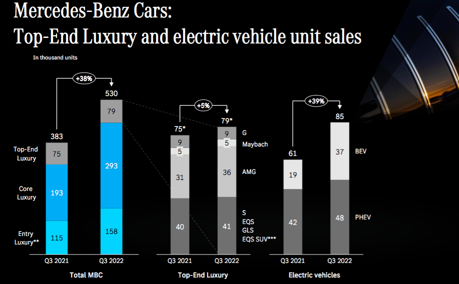 而EQS与AMG EQS 53的调价,则体现出奔驰持续深化聚焦高端豪华、提速全面电动的战略定力。奔驰第三季度财报数据印证了上述战略的成效。奔驰2022年Q3高端豪华车销量同比增长38%;新能源车销量增长39%,其中,纯电动车销量同比翻番。