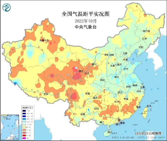 举个例子,比如我们假设在 8 月就能百分之百的准确预测 10 月的气候状态,事先知道了下面这一张 10 月气温距离平均状况偏差的实况,发现除华北和东北地区气温变化不大外,其他地区的气温都会有所偏高。