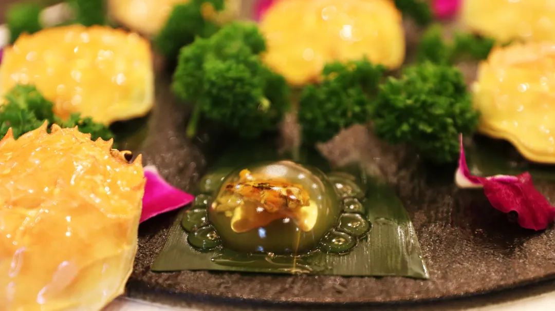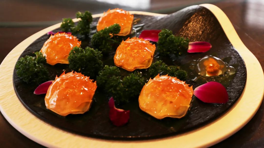 曾经横行天下的蟹将军卸下盔甲,化身鲜香滑弹的小可爱,看一眼就忍不住要去尝一下。蟹的肥美被封存在清凉冰爽的口感中,刚好可以滋润秋天的燥气,十分符合大众的口味。精心熬制的蟹汤巧制成胶冻,入口即化,咸鲜滋味在舌尖蔓延。