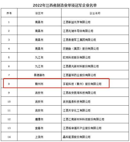 赣州市教育局发布关于增加2022年下半年赣州市高中(中职)教师资格认定时间的公告,2022年11月7日—11月13日开展的2022年下半年赣州市高中(含中职)教师资格认定(社会人员)现场确认工作,因部分申请人受疫情影响,未能在规定时间内参加现场确认工作,现新增现场确认时间:2022年11月19日—11月20日(上午8:30—12:00,下午14:30—17:00)。江西认定14家企业“江西省制造业单项冠军企业”称号,赣州市孚能科技(赣州)股份有限公司上榜。认定有效期三年,有效期自2022年12月1日至2025年11月30日。