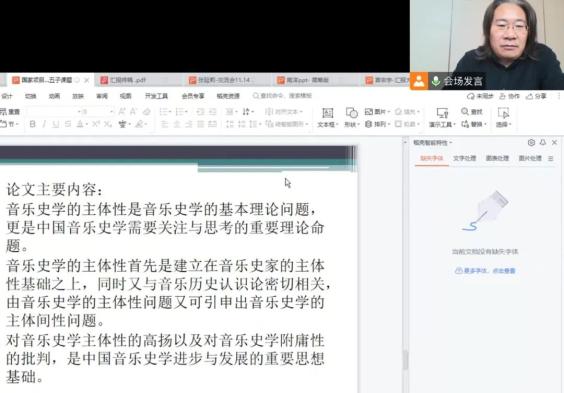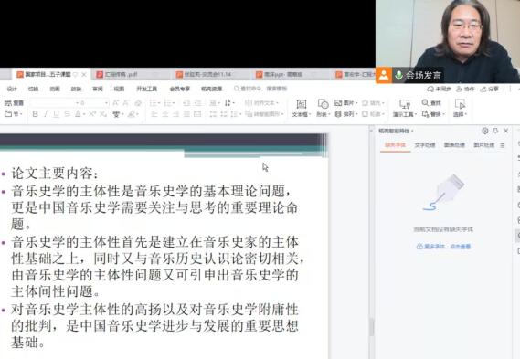 洛秦发言第二单元的主题为“中国音乐史学与其他相关学科关系的分析与研究”,由伍维曦教授主持。他陈述了该子课题的基本思路。接着,本单元参与者杨成秀、康瑞军、黄艺鸥、孙焱分别从各自的撰写章节进行了论述。杨成秀就《中国音乐史学对于传统学术的继承与吸纳》进行论述,其他成员演讲的内容作为课题的部分阶段性成果已发表于《中国音乐》2022年第2期的相应专栏,如伍维曦的《中国音乐史学与现代学术思维》、康瑞军与胡斌的《当代中国语境中的“音乐新史学”理念与实践》、黄艺鸥的《中国音乐史学的领域划分、疏离与整合》、胡斌与孙焱的《互鉴共赢殊途同归——从“学术史”视角看中国音乐史学与中国传统音乐研究、Ethnomusicology的学科关系》。