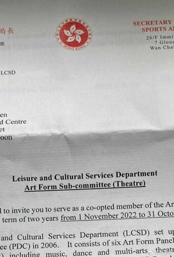据香港特区政府新闻公报此前消息,香港文化体育及旅游局于11月1日公布了新一届节目与发展委员会及其下辖的六个演艺专责委员会(音乐、舞蹈及跨媒体艺术、戏剧、中国传统表演艺术、社区及艺术节)的委任信息。