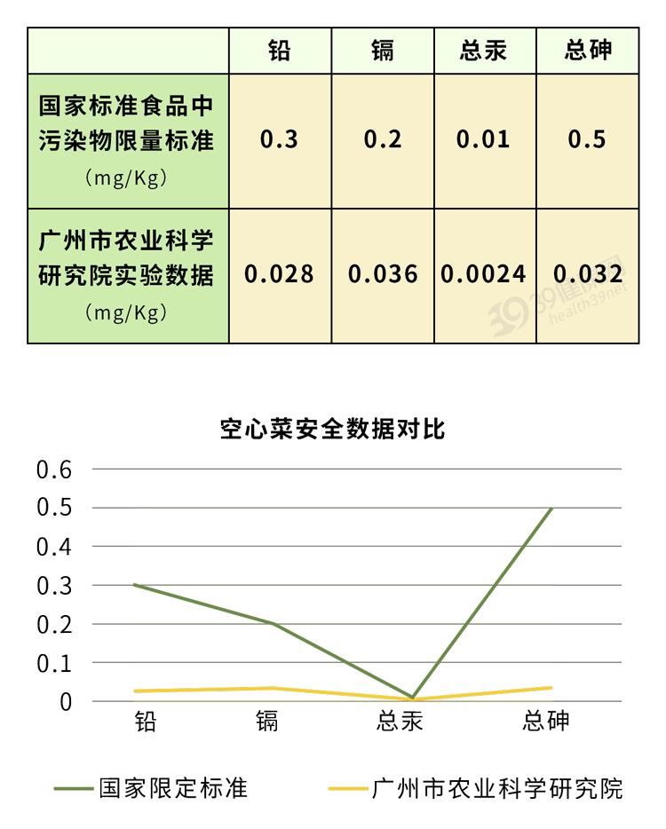 广州市农业科学研究院在对空心菜进行的重金属检测中发现,铅、镉、总汞、总砷4种重金属在空心菜中的最高含量分别为0.028、0.036、0.0024、0.032(mg/Kg)。