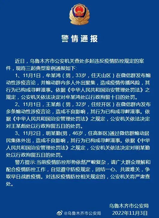 四、新疆乌鲁木齐警方:多人编造虚假疫情信息被罚