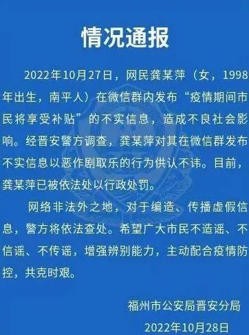六、福建福州警方:一人因发布疫情不实消息、言论被罚